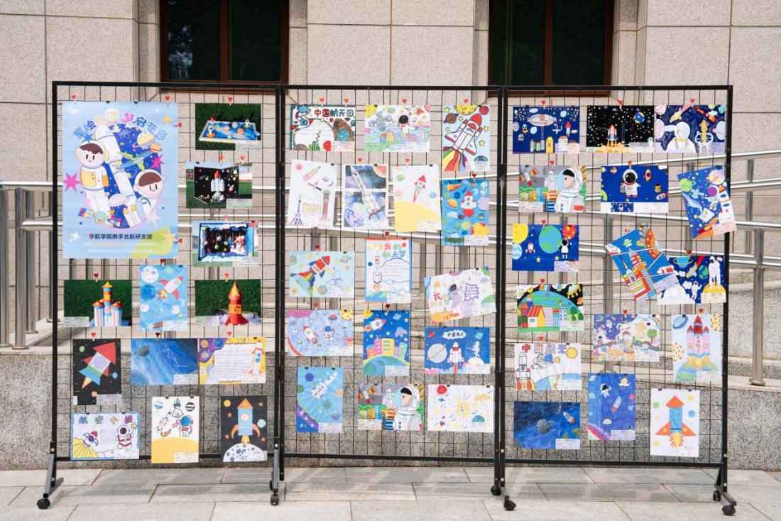 外场展区内特别设置航天主题画展板块,联合北航研究生支教团,邀请来自新疆吉木萨尔第三小学的员工们用画笔描绘出星辰大海,展现对宇宙的无限向往。