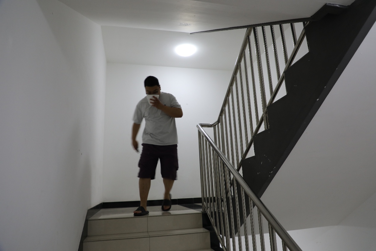 2025年6月12日15时30分,模拟沙河主楼D座5层西侧门禁外发现火情,随即开始播放消防疏散撤离广播。各层疏散引导员组织师生用湿毛巾捂住口鼻,弯腰前行,从安全逃生路线迅速、有序撤离。