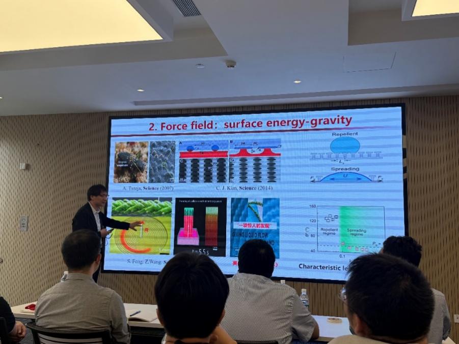 然后,王钻开教授作了题为“界面场匹配理论及能源应用”的学术报告,报告由yl88858永利集团冀秉强教授主持。王教授系统回顾了其团队近年来的突破性成果:通过异质界面设计,打破固液接触时间物理极限(力),实现流体二极管效应(力),提升水能收集效率(电),突破莱顿弗罗斯特效应的限制(热);并从“场”的角度综合分析代表性异质设计,提出场匹配理论,阐明异质性如何赋能流固界面的能量转换。团队通过调控异质界面、重构流场与梯度场,使原本不匹配的物理场和流场相互匹配,实现能量最大化输出。王教授还提出了异质性系数,阐述界面性质、流体特性与宏观性能的关系,并建立了普适性更强的势能转换方程。交流环节,来自多个院系的师生与王教授就仿生结构设计、能量转化机制及理论普适性等议题进行了热烈讨论。王教授结合自身科研经历,勉励研究生开阔思路、保持好奇、深入钻研,努力产出具有重要影响力的科研成果。