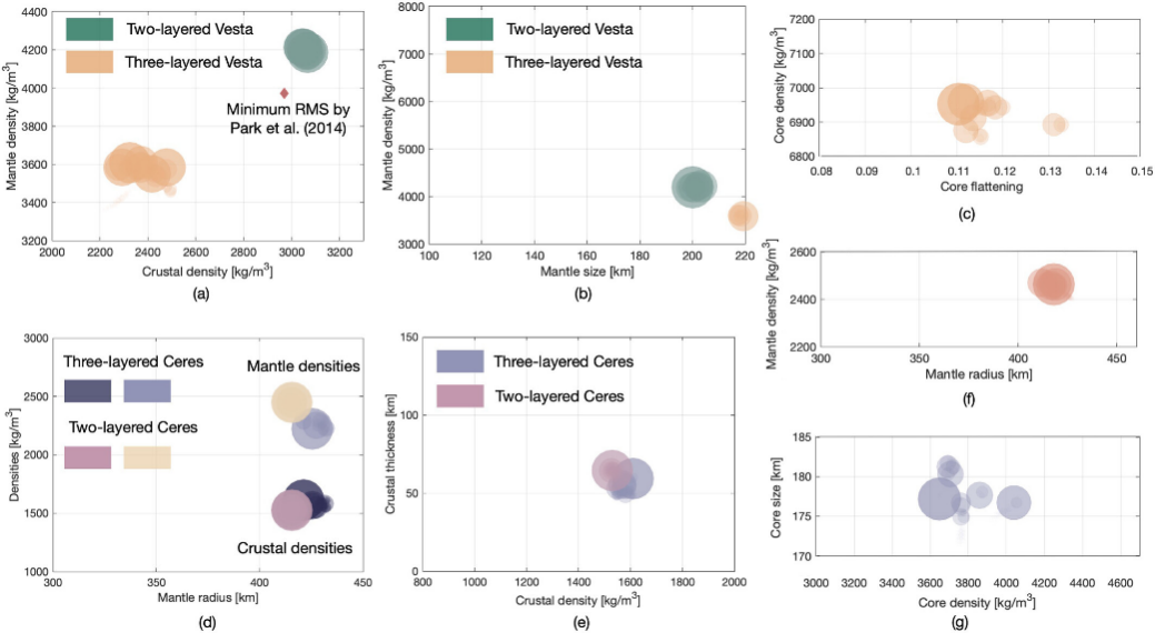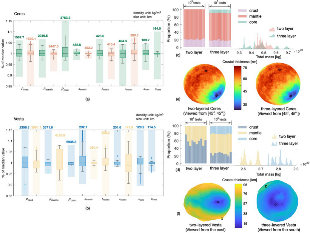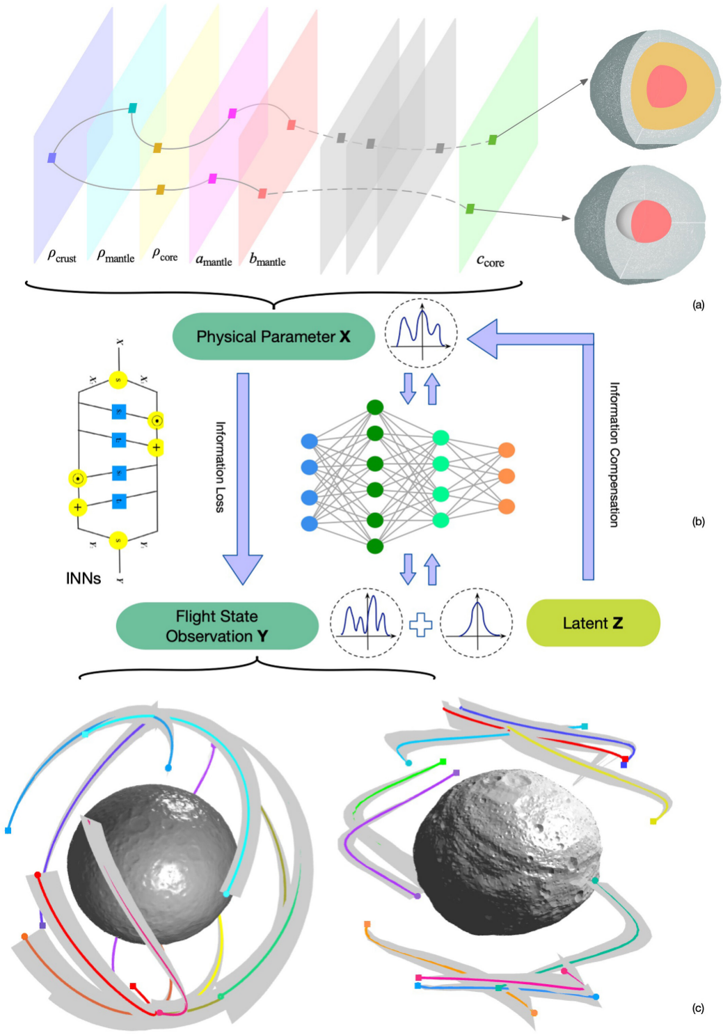 传统方法必须依赖大量测距、测速及光学成像数据建立完整的重力场模型,并在任务后期通过地面反演计算逐步推断出包括地壳、地幔、地核在内的层状结构;而该工作首次将可逆神经网络引入小天体结构推断过程,通过在任务前利用先验物理参数生成飞行状态数据集,使神经网络同时学习内部结构与轨道演化之间的双向映射关系。训练完成后,该模型能够在存在导航噪声的情况下,仅依靠航天器短时间的飞行状态,即刻给出小行星内部密度分层、核心尺寸和地壳厚度等关键结构参数,并在谷神星与灶神星的真实飞行数据验证中,与传统重力场反演所得的质量分布、扁率系数及重力异乎现象高度一致,从而展示出在未来深空自主探测中实现实时环境感知的潜力。