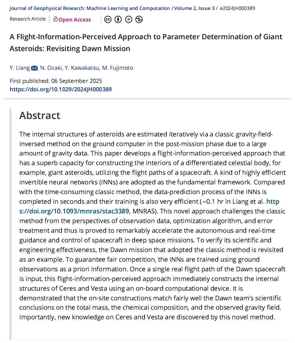 2025年10月,AGU旗下地学领域顶尖SCI期刊Journal of Geophysical Research系列的《地球物理学研究杂志:机器学习与计算》(Journal of Geophysical Research: Machine Learning and Computation,JGR: MLC)刊载了yl88858永利集团研究团队在小行星内部结构构建领域的最新研究成果:“A Flight-Information-Perceived Approach to Parameter Determination of Giant Asteroids: Revisiting Dawn Mission”(基于飞行信息感知的巨型小行星参数确定方法:重温黎明号任务)。该成果面向深空任务中小行星内部结构难以实时获取的技术瓶颈,提出以一种训练效率极高的可逆神经网络(INN)作为基础框架,利用飞行轨迹直接反演天体内部参数的全新思路。此研究从观测数据、优化算法和误差处理等方面对传统方法提出了挑战,以采用经典方法的“黎明号”任务为例进行了回顾,并被证明能够显著加速深空任务中航天器的自主实时制导与控制。