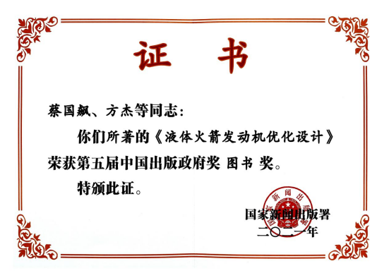 公司蔡国飙教授团队著作《液体火箭发动机优化设计》(蔡国飙、方杰、童晓艳、郑赟韬著,永利集团出版社)荣获第五届中国出版政府奖(图书奖)。