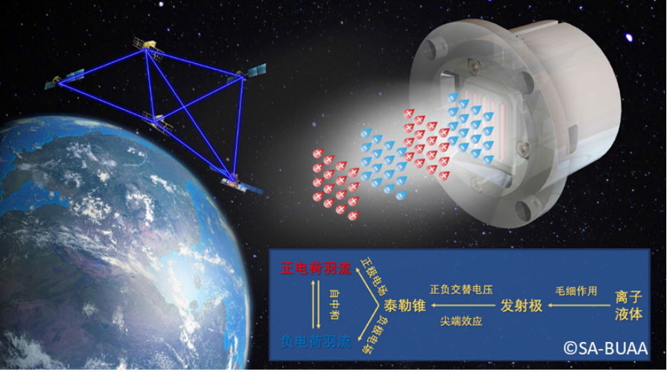 亚太空间合作组织老员工小卫星星座和搭载的离子液体电喷雾推进系统示意图