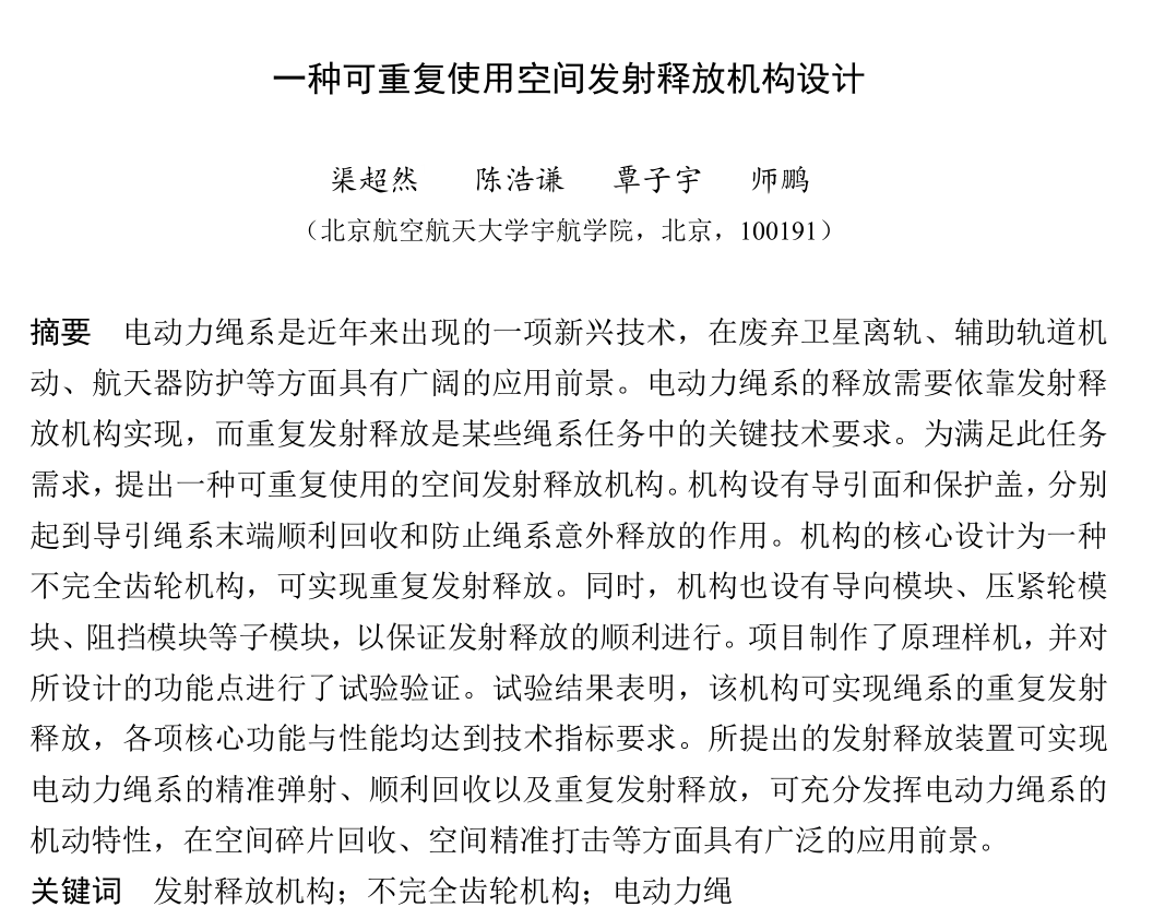 yl88858永利集团本科生渠超然提交的论文是在北航第三十一届“冯如杯”员工学术科技作品竞赛获奖作品“可重复使用空间发射释放装置”基础上的拓展性研究成果。该论文提出了一种可重复使用的空间发射释放机构。机构的核心设计为一种不完全齿轮机构,可实现重复发射释放。同时,机构也设有导向模块、压紧轮模块、阻挡模块等子模块,以保证发射释放的顺利进行。研究团队在制作原理样机的基础上对所设计的功能点进行了试验验证。试验结果表明,所提出的发射释放装置可实现电动力绳系的精准弹射、顺利回收以及重复发射释放,可充分发挥电动力绳系的机动特性,在空间碎片回收、空间精准打击等方面具有广泛的应用前景。