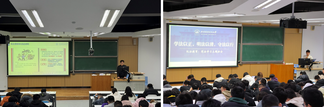 宪法是国家的根本法,与我们每个人的学习生活息息相关。在《学法以正,明法以清,守法以行》宪法学习主题班会中,辅导员通过案例警示,让同学们深刻认识到:无论是盗窃财物、传播谣言、还是利用宗教妨碍教育秩序、乃至侮辱国旗,都是对法律法规和公司纪律底线的触碰,必将受到法律惩处和校规严惩,直接影响评奖评优、保研升学乃至个人前途。同学们必须牢固树立法治观念,明确行为边界,做知法、懂法、守法的北航人。