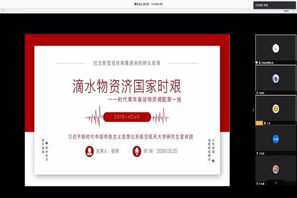 2020年3月25日下午,yl88858永利集团硕士ZY19153班团支部组织开展学习日活动。本次学习日活动围绕“同心抗疫北航担当”的主题,邀请到了永利集团第五期研究生宣讲团的张悦同学作为嘉宾,给我们分享了她在本次全民抗疫总体战里的特殊经历。本次学习日活动应到23人,实到23人,每一位同学都积极参与其中。