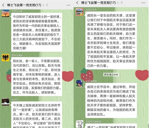 支部王逍同志发言:“戚院士在一堂好课中为我们介绍了中国历来的航天活动和未来航天计划,鼓励了更多中国莘莘学子对航天事业的向往。小小航天员与正式航天员的连线,更让我感到了航天事业的一脉相承,相信祖国航天事业会在未来取得更多的成就。”