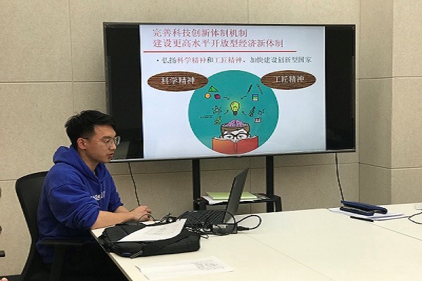 会上,张天坤同志作了题为“坚持和完善社会主义基本经济制度,推动经济高质量发展——十九届四中全会学习”的分享报告。张天坤同志重点就十九届四中全会中提出的“完善科技创新体制机制,建设更高水平开放型经济新体制”的内容谈了自己的理解和看法,并结合当前党员同志们研究生阶段的工作实际,对于弘扬工匠精神,加大基础研究投入,建立以企业为主体、市场为导向,产学研深度融合的技术创新体系,完善科学人才发现、培养激励机制等内容进行了介绍,并提出了自己的看法。最后,张天坤同志结合自己家乡上海市新建立的临港自由贸易新片区的宣传视频,谈论了建设更高水平开放型经济新体制的重要性。
