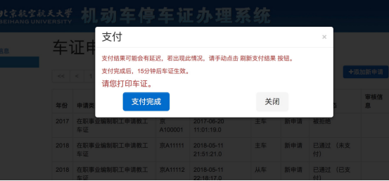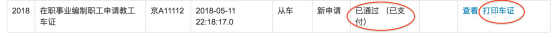 此时“办理状态”应显示为“已通过(已支付)”,可开始打印车证。