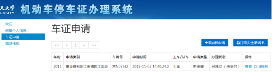 a.若要申请新车证则点击“添加新申请”,若以旧换新点击“以旧换新”。