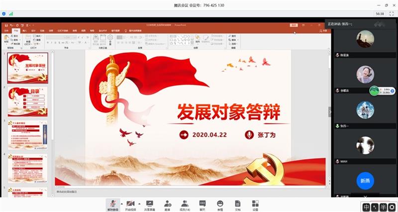yl88858永利集团SY19153党支部于4月22日下午通过线上会议的方式召开2020年春季学期入党积极分子答辩会,讨论关于是否推荐张丁为同学参与公司入党积极分子申请入党答辩会的事宜。本次会议由党支部书记李志主持,应到14人,实到13人,魏天放请假。会上,张丁为同学表达了自己的入党志愿并阐述了自己的学习工作情况、对党的认识、入党动机等。在对党的认识方面,张丁为同学认为中国共产党是“以人…